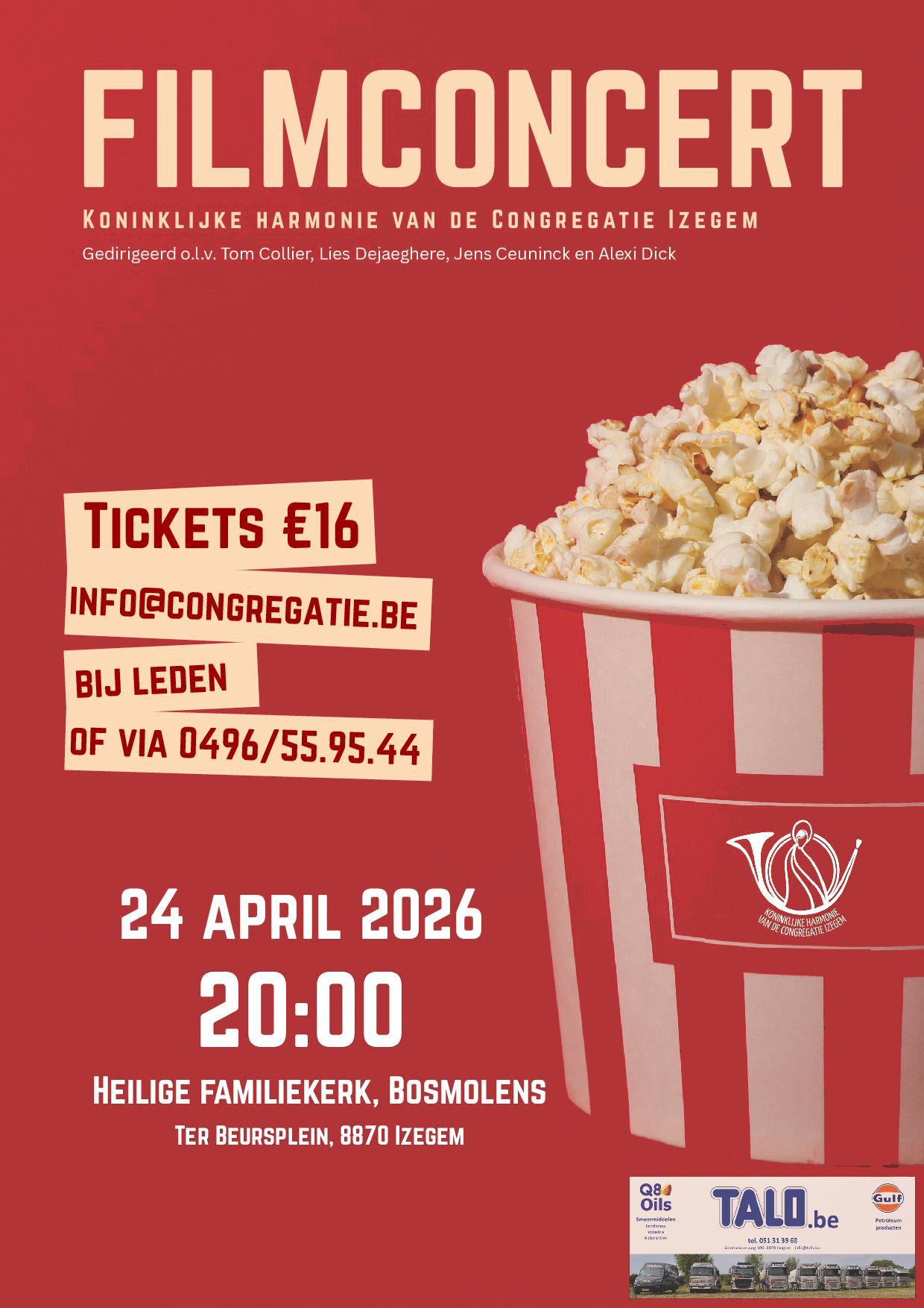 Laat je meevoeren in een unieke filmische ervaring waar muziek niet enkel ondersteunt, maar de film mee vertelt. Tijdens dit filmconcert brengt de Koninklijke Harmonie van de Congregatie Izegem live de meeslepende soundtracks die je recht naar het hart van het verhaal voeren.